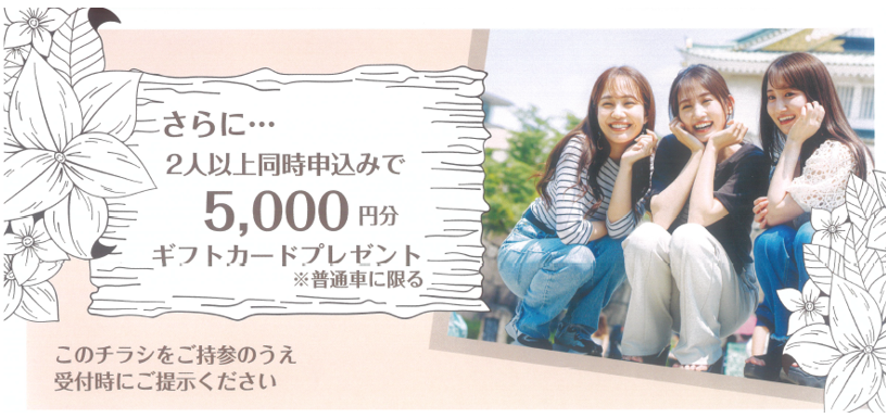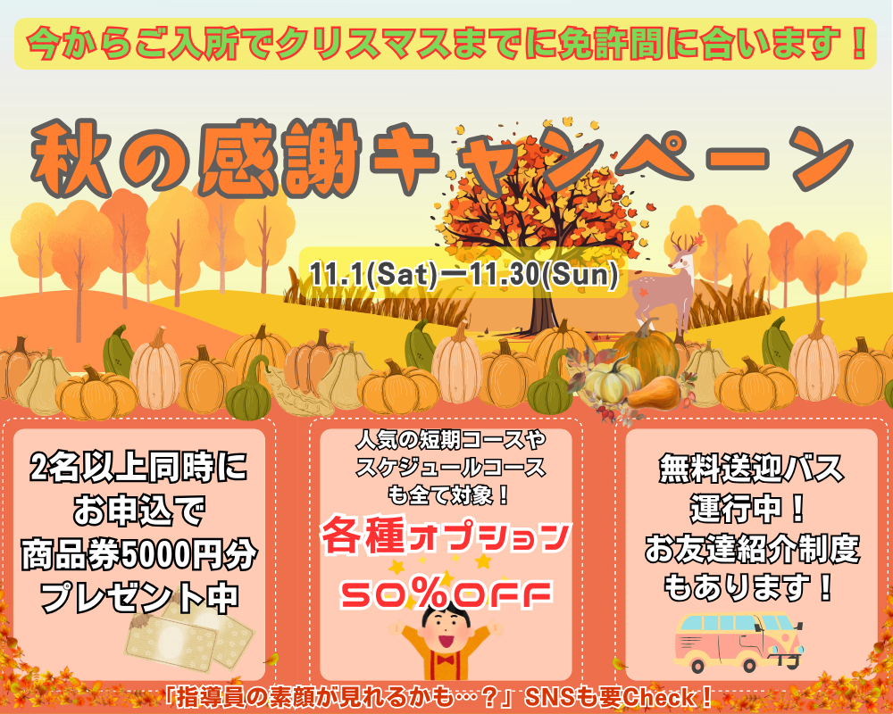 - 【秋の感謝キャンペーン】11/30までのお申込・ご成約で各種オプションを50%OFF!お友達と一緒にお申込でお得な特典も!【無料送迎・紹介制度もあり】