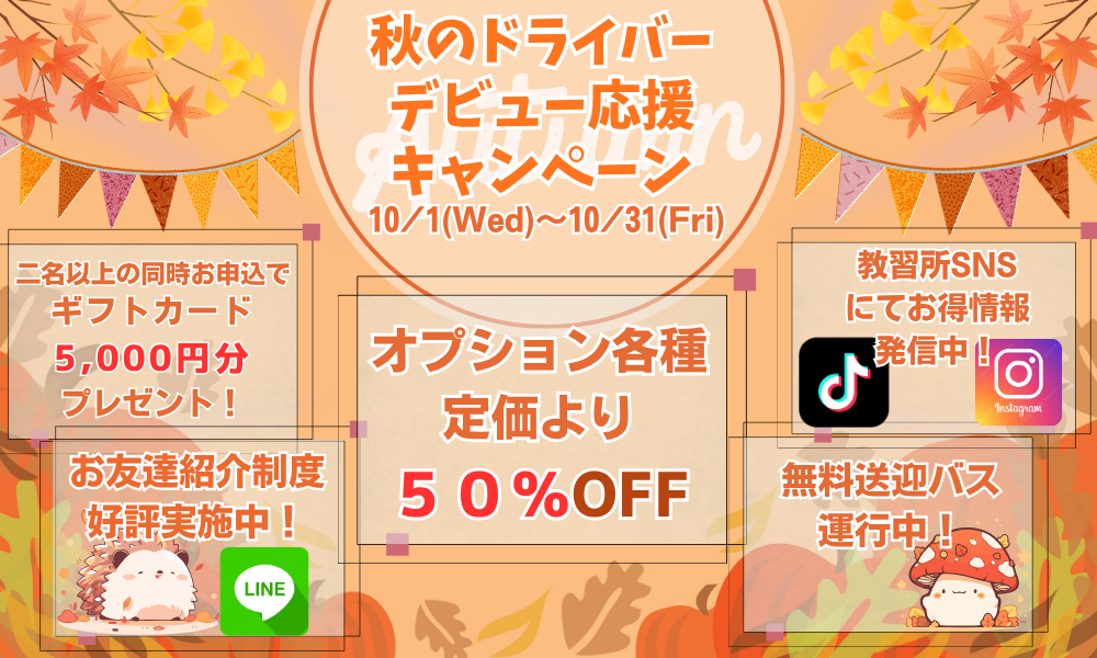 - 10月31日までのお申込、ご成約でオプション各種半額にてご提供!二人以上の同時お申込でさらにお得に…!無料送迎・紹介制度もあります