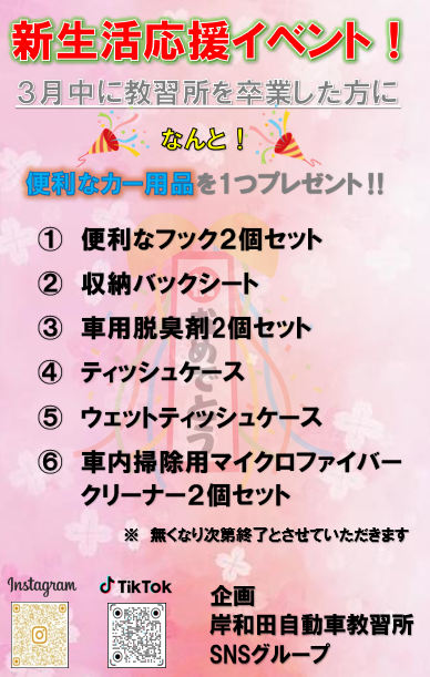 - 新生活応援イベント開催!3月中に教習所を卒業した方に…なんと‼便利なカー用品を1つプレゼント‼