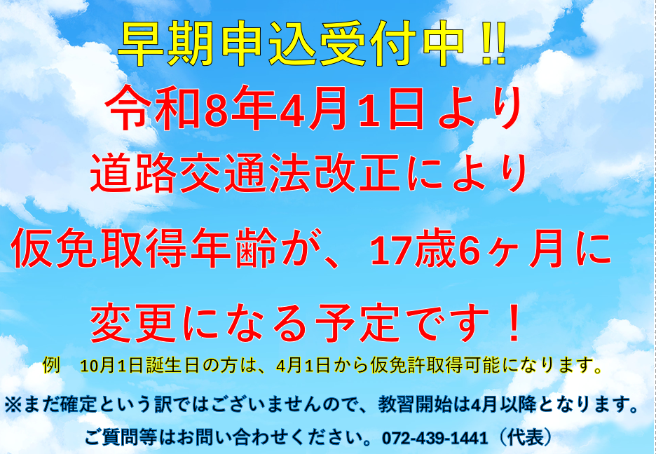 - 早期申込受付中!令和8年4月1日より、仮免許取得年齢が17歳6ヶ月に変更されます!