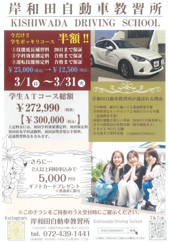 3月キャンペーン AT学生ポッキリコース半額‼